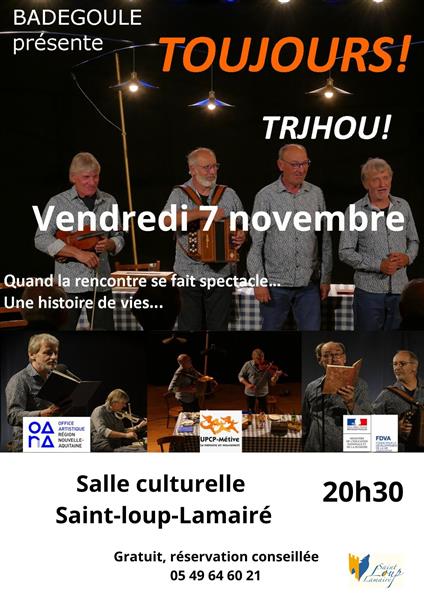 Un spectacle de l’association BADEGOULE, coproduit / UPCP-METIVE avec 2 comédiens/conteurs/raconteurs, 2 musiciens, la mise en scène / Igor Potoczny de la compagnie Aline, est proposé à 20 h 30 à la salle de spectacle à Saint-Loup-Lamairé. Au début des années 70, ils entreprennent, auprès de leurs aïeux, la moisson de tout ce qui a trait à la culture de l'oralité : chants, danses, musiques, contes, croyances, superstitions... Des mémoires, des consciences qui se démêlent et leur révèlent des écheveaux de vies, des amours, des luttes… l’émotion est grande. Ce sont ces rencontres, ces partages… résonnant encore dans une actualité bouleversée de ce début de 21ème siècle, qu’au travers de quelques portraits de femmes et d’hommes hors du commun, ils ont décidé de porter sur scène en paroles et musiques. C’est avant tout de l’humain, un témoignage pour transmettre encore et encore...