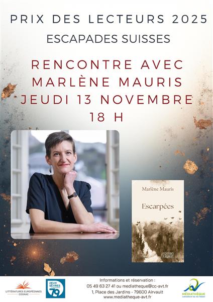 Dans le cadre du Prix des Lecteurs 2025 des Littératures Européennes Cognac, venez rencontrer une autrice de la sélection, Marlène Mauris, pour un moment de discussion et de partage. Rendez-vous à 18 h à la Médiathèque, 1 Place des Jardins à Airvault. Informations et réservations au 05 49 63 27 41 ou mediatheque@cc-avt.fr