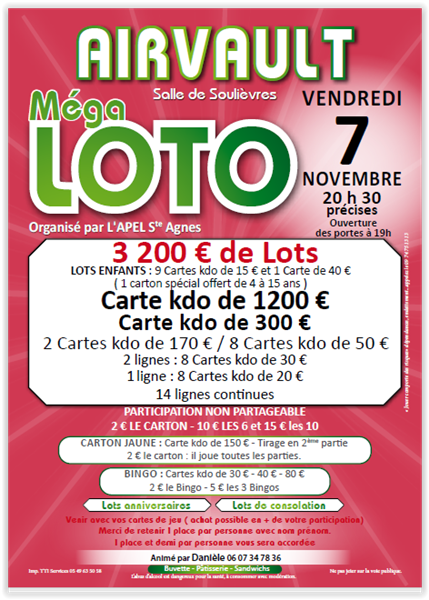 L'APEL Sainte-Agnès à Airvault propose un loto à la salle de Soulièvres. Ouverture des portes à 19 h et début à 20 h 30 précises. Loto avec vos cartons personnels obligatoires. Possibilité d'achat de cartons sur place : 2 € le carton, 10 € les 6 et 15 € les 10. Au total : 3200 € de lots. Informations et réservations au 06 07 34 78 36.