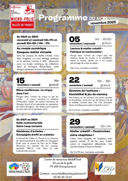 La Micro-Folie Vallée du Thouet est un espace culturel innovant qui propose un musée numérique, des ateliers d'arts plastiques et des activités au Fablab. En novembre, dans les casques de réalité virtuelle, vivez Dear Angelica, un court métrage poétique où la peinture s’anime à 360°. Découvrez aussi, les collections Sport et Auvergne Rhône-Alpes, entre énergie olympique et savoir-faire textile. La visite libre du musée et les casque de réalité virtuelle, sont accessibles lors des horaires d'ouverture, les mercredis et vendredi, de 14 h à 17 h et le samedi, de 10 h à 12 h et de 14 h à 17 h. De plus, des animations seront proposées tout le mois : atelier créatif le mercredi 5 novembre, une micro conférence le samedi 15 novembre, une résidence artistique du 24 au 29 novembre, une lecture kamishibaï et jeu de mémory le 22 novembre et un atelier créatif le samedi 29 novembre à 15 h.