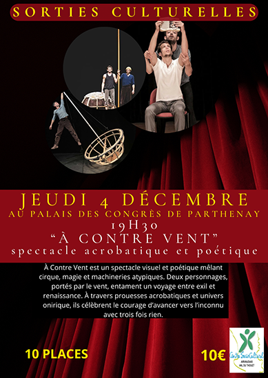 Une sortie est proposée au Palais des Congrès de Parthenay, pour découvrir le spectacle "À contre vent", avec la compagnie 3 x Rien, un spectacle acrobatique et poétique. "À contre vent est un spectacle visuel & poétique mêlant cirque, magie & machineries atypiques. Deux personnages portés par le vent, entament un voyage entre exil et renaissance. A travers prouesses acrobatiques et un univers onirique, ils célèbrent le courage d’avancer vers l’inconnu avec trois fois rien. " Rendez-vous à 19 h 30 au Centre Socio Culturel au 16 ter rue Emmanuel Bonnet à Airvault. Réservations au 05 49 64 73 10.
