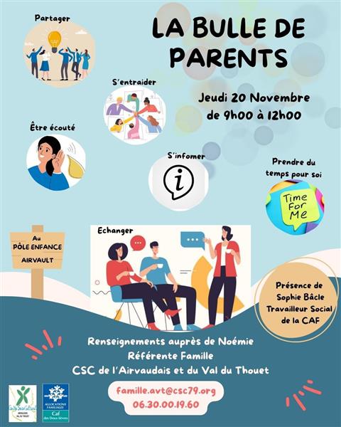 Le Centre Socio Culturel propose une bulle pour les parents pour partager, être écouté, s'informer, prendre du temps pour soi, échanger... En présence de Sophie Bâcle, travailleur social de la CAF et de Noémie, référente famille. Rendez-vous le jeudi 20 novembre, de 9 h à 12 h, au Relais Petite Enfance à Airvault. Animation gratuite. Pour plus d'informations, veuillez contacter le 06 30 00 19 60 ou faire une demande par mail : famille.avt@csc79.org