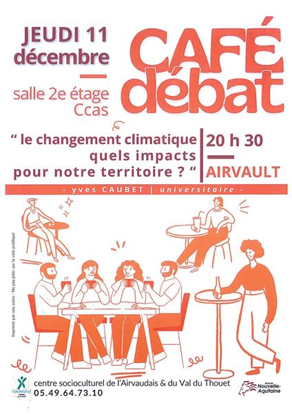 Le Centre Socio Culturel de l’Airvaudais et du Val du Thouet organise un nouveau café débat, en présence d'Yves Caubet, universitaire. La thématique du jour : "Le changement climatique, quels impacts pour notre territoire ?". Rendez-vous à 20 h 30, à la salle du 2ème étage du CCAS, au 16 ter rue Emmanuel Bonnet à Airvault. Renseignements : 05 49 64 73 10.