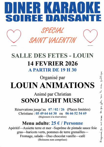 L'association Louin Animations propose un dîner karaoké, une soirée dansante, spécial Saint Valentin, à partir de 19 h 30, à la salle des fêtes. Animé par Christian, SONO LIGHT MUSIC. Réservations obligatoires jusqu'au 7 février : 05 49 64 64 30 ou 06 66 52 54 69 (règlement à la réservation). Menu adulte à 25 € par personne : apéritif : assiette terre et mer, suprême de pintade sauce foie