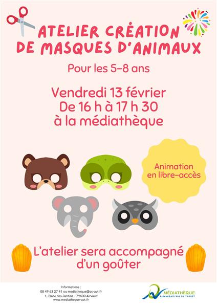 Venez fabriquer votre masque d'animal sur un temps libre entre 16 h et 17 h 30 à la Médiathèque, avec plusieurs modèles au choix, tous inspirés de La Famille Lavande, une série d'album jeunesse écrite par Sandra Le Guen et illustrée par Maurèen Poignonec. Un goûter proposé par la médiathèque accompagnera cet atelier. Gratuit. Pour les 5-8 ans. Animation en libre accès. Plus d'informations : 05 49 63 27 41 / mediatheque@cc-avt.fr