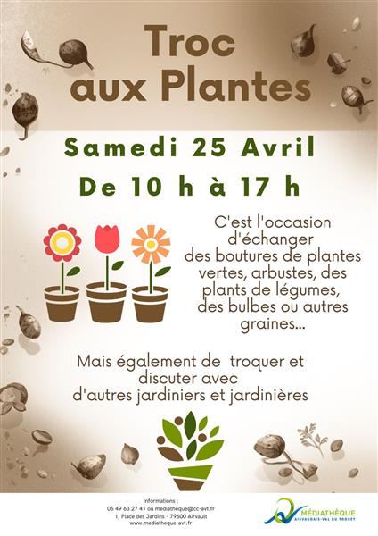 C'est quoi un troc aux plantes ? C'est l'occasion d'échanger des boutures de plantes vertes, arbustes, des plants de légumes, des bulbes ou autres graines... Venez troquer et discuter avec d'autres jardiniers-ères, à la Médiathèque Airvaudais-Val du Thouet, de 10 h à 17 h. Informations : 05 49 63 27 41 / mediatheque@cc-avt.fr