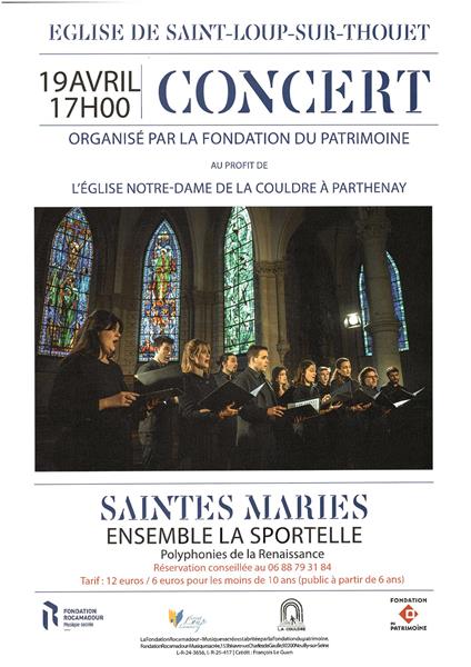 La fondation du patrimoine propose un concert en l'église de Saint-Loup-sur-Thouet, au profit de l'église Notre-Dame de la Coudre à Parthenay. Saintes Maries, ensemble la sportelle, polyphonies de la Renaissance. Réservation conseillée au 06 88 79 31 84. Tarifs : 12 € et 6 pour les moins de 10 ans (concert conseillé à partir de 6 ans).