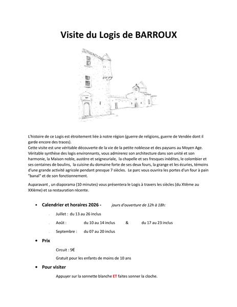 En visitant ce logis, vous pouvez admirer : la cour d’honneur avec sa chapelle, son colombier, sa cuisine médiévale... le jardin et son four à pain. Le logis de Barroux est la synthèse de tous les logis de la région sur le plan architectural (système de défense, cour d'honneur fermée avec maison noble, chapelle, colombier, écurie...). Son histoire est étroitement liée à notre région : guerre de religions, guerre de Vendée... dont il garde encore des traces. Cette visite est une véritable découverte de la vie de la petite noblesse et des paysans du Moyen-Age. Le Logis se visite en saison estivale ou sur demande auprès du propriétaire. En 2026, le Logis sera ouvert de 12 h à 18 h : du 13 au 26 juillet, et en août, du 10 au 14 et du 17 au 23, puis du 7 au 20 septembre. Tarif : 5 € le circuit, gratuit jusqu'à 10 ans.