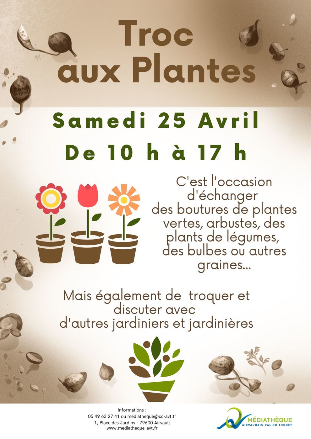 Comme chaque année, la médiathèque, qui est également une grainothèque, propose une journée entière consacrée au Troc aux Plantes. C'est l'occasion de venir échanger des boutures de plantes vertes, arbustes, des plants de légumes, des bulbes ou autres graines... mais également de troquer et discuter avec d'autres jardiniers et jardinières.