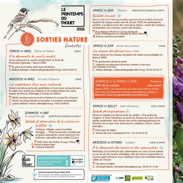 Venez à la découverte des amphibiens d'une mare restaurée dans le cadre d'un projet de création et de revalorisation de mares auprès de fermes d'élevages à l'herbe en Gâtine. Prévoir une lampe frontale et des bottes. Rendez-vous à 20 h 30 au carrefour entre la rue de la Tuilerie et la rue des Pins à Enjouran. Inscriptions recommandée auprès de Deux-Sèvres Nature Environnement : 06 07 28 89 81 / ludovic.rolland@dsne.org . Retrouvez les animations du Printemps du Thouet dans les images.