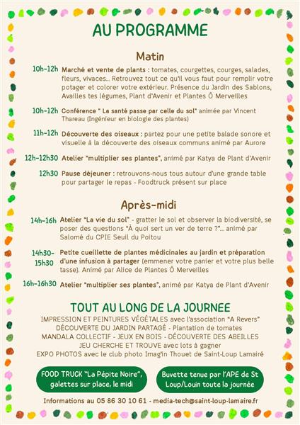 Rendez-vous de 10 h à 17 h, au Jardin Partagé à Saint-Loup-sur-Thouet. Marché et vente de plants de 10 h à 12 h, conférence "La santé passe par celle du sol", de 10 h à 12 h, découverte des oiseaux de 11 h à 12 h, atelier "multiplier ses plantes" de 12h à 12 h 30, pause déjeuner : retrouvons nous autour d'un repas, foodtruck présent. De 14 h à 16 h atelier "la vie du sol", 14 h 30 - 15 h 30 cueillette de plantes médicinales et préparation d'une infusion, de 16 h à 16 h 30, atelier multiplier ses plantes. Tout au long de la journée : impression et peintures végétales, découverte du jardin partagé, mandala collectif, jeux en bois, découverte des abeilles, jeu chercher et trouve et exposition de photos. Programme complet dans les images. Buvette sur place toute la journée. Informations au 05 86 30 10 61 / media-tech@saint-loup-lamaire.fr