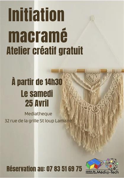 La Médi@tech propose un atelier macramé de 15 h à 17 h, niveau débutant, avec Nathalie. Possibilité d'apporter son matériel. L'animation est gratuite, l'inscription est obligatoire, jauge limitée. Informations et réservations : 05 86 30 10 61 / media-tech@saint-loup-lamaire.fr