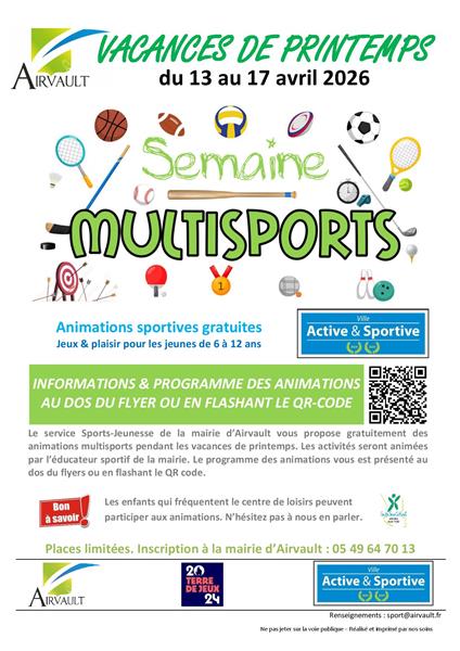 Le Service des Sports de la ville organise une semaine multisports du 13 au 17 avril. Les jeunes de 6 à 12 ans pourront découvrir gratuitement des activités sportives diverses : tir à l'arc, biathlon, chase tag, course d'orientation, baseball thèque, golf, pêche, balle aux prisonniers... Le programme est disponible dans les images et en mairie d'Airvault. Informations : pour vous inscrire, merci d'appeler l'accueil de la mairie aux heures d'ouverture : 05 49 64 70 13.